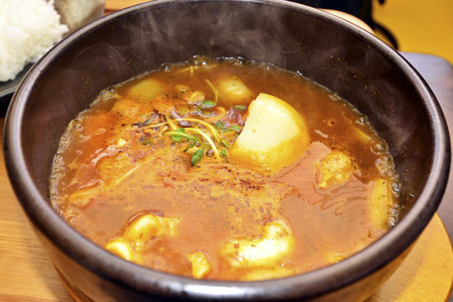 で、私は、なぶらスープカレーを選択。ぐつぐつ煮たった熱々のスープカレーでした。隣のテーブルで食べていた若いお客さんたちは、辛くてではなく、熱くて、水のお代わりを頼んでいました。